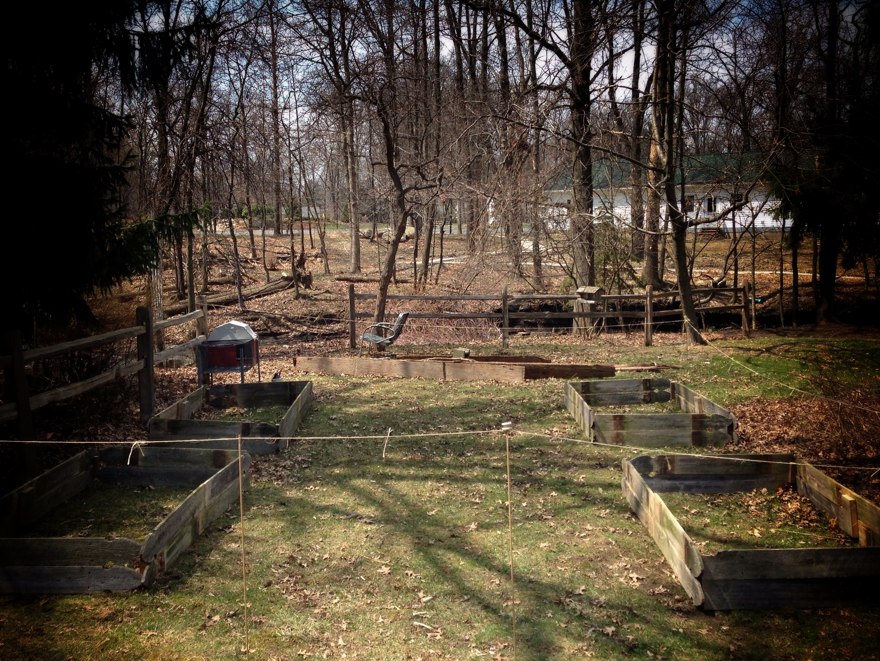 the plan calls for five raised beds (one for herbs, up near the house and the remaining four down near the stream will hold vegetables of all kinds)