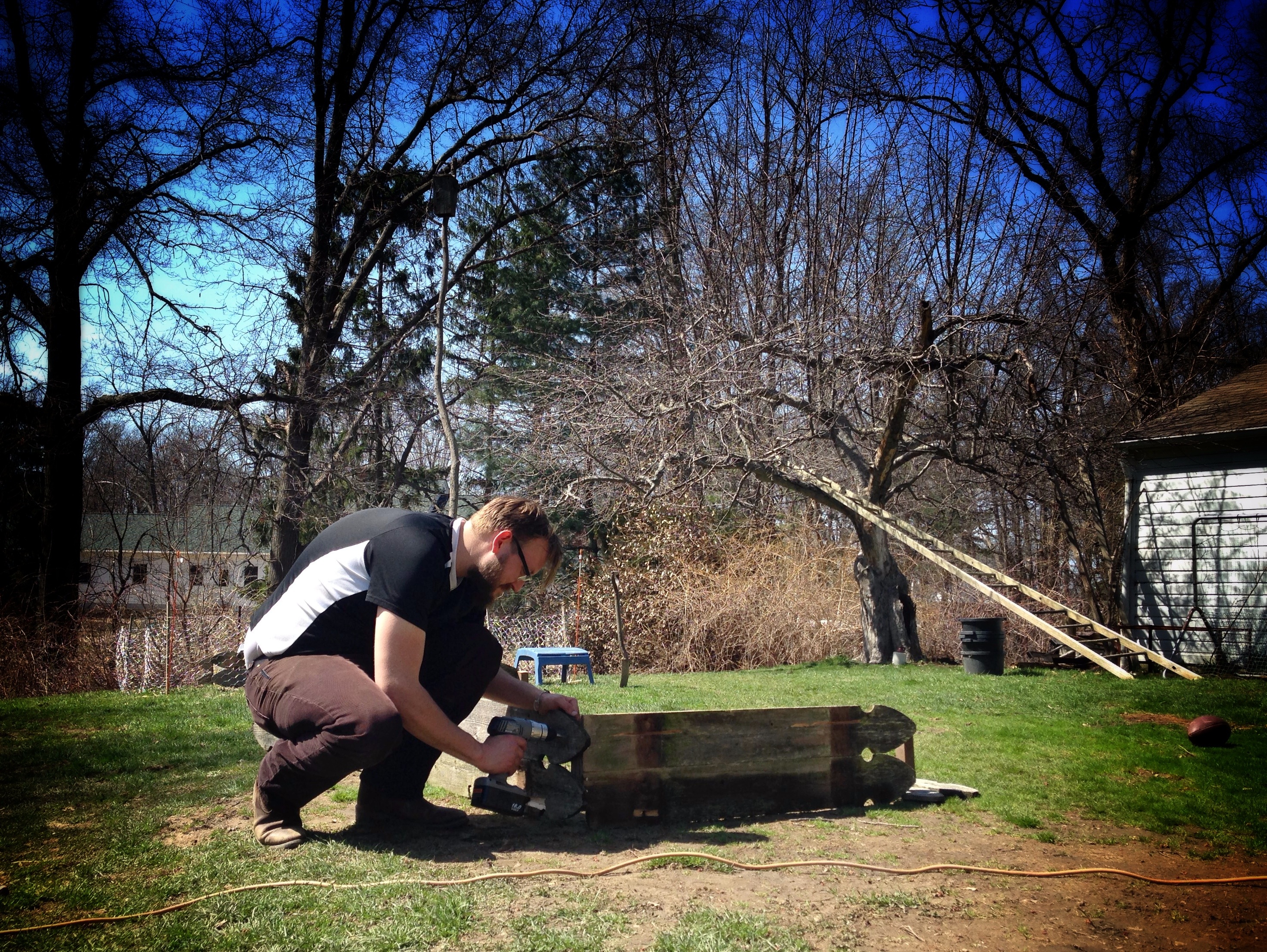 as we planned them out; measuring, estimating, researching costs…we realized that the largest expense would be the wood to frame out the beds. finding old wood seemed like the best solution. and just as we asked for it, the Universe (or garbage day) supplied it in the form of a neighbor ridding himself of a picket fence. the pickets were the perfect, pre-cut size and add an adorable home-made re-purposed farm look to the boxes.