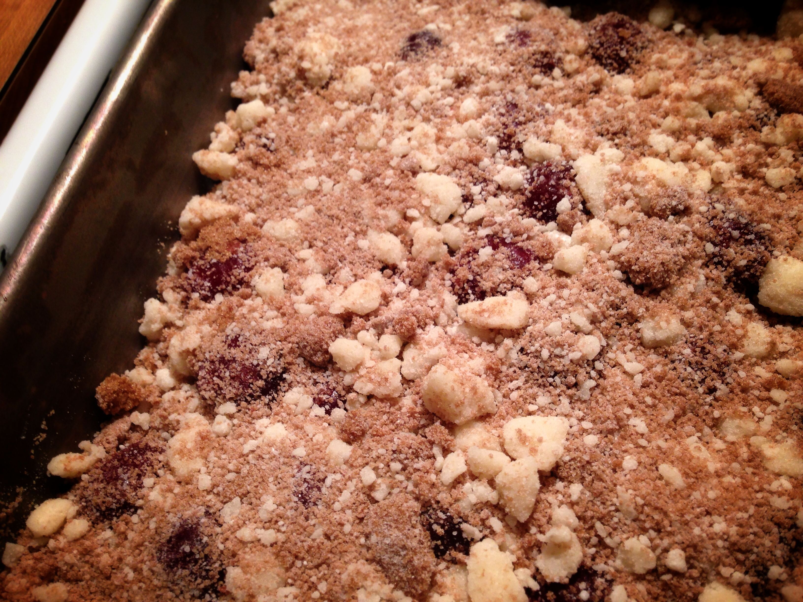 - Remove the crumble topping from the freezer and sprinkle it in an even layer on top of the cherries. Press down on the topping gently but firmly.