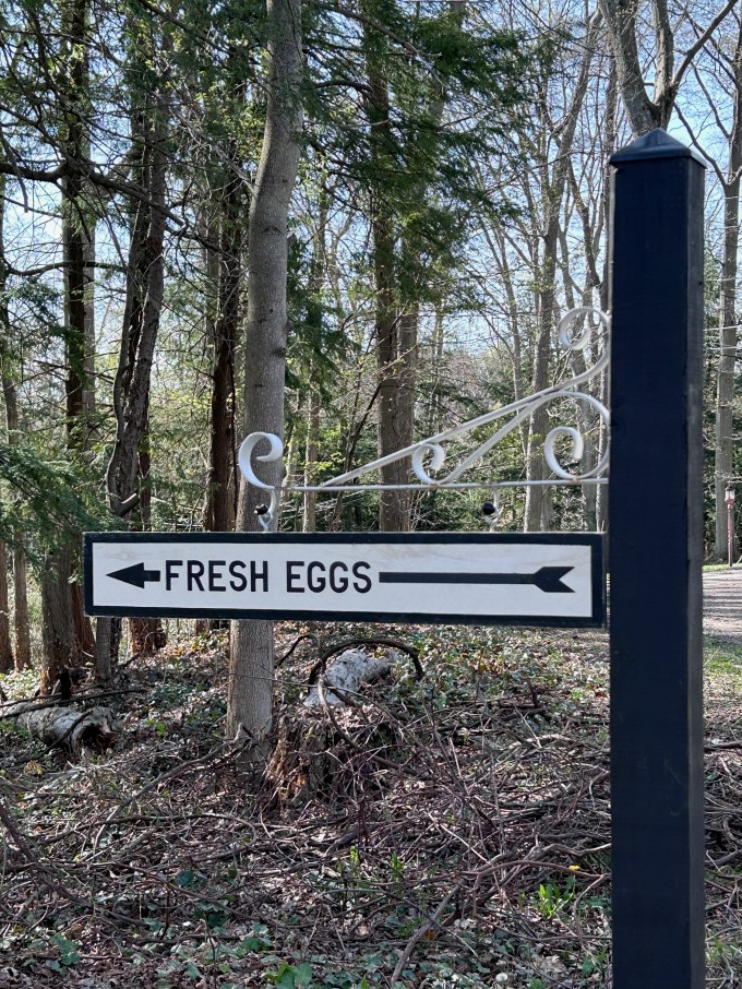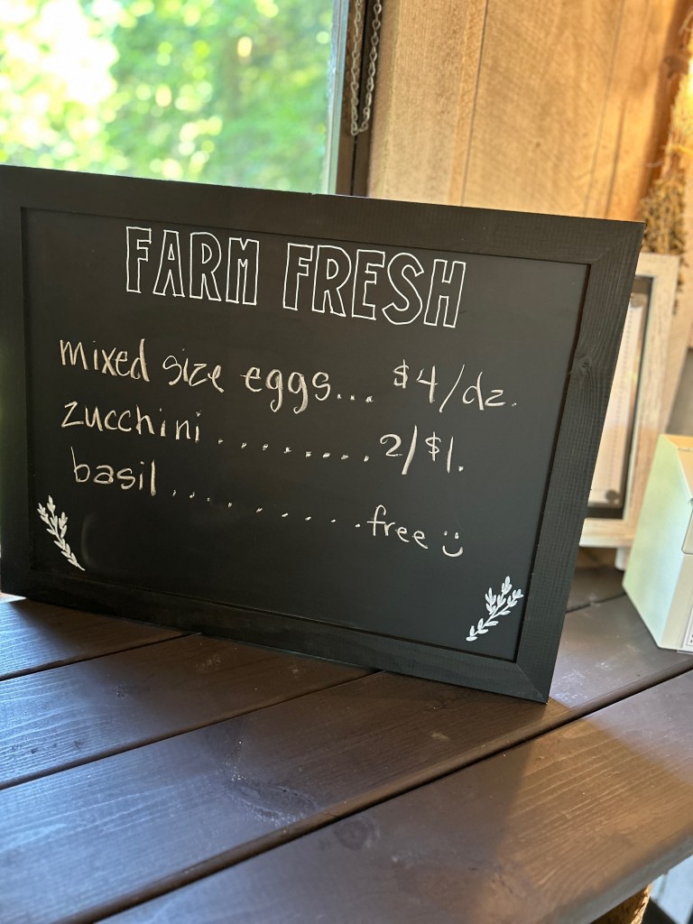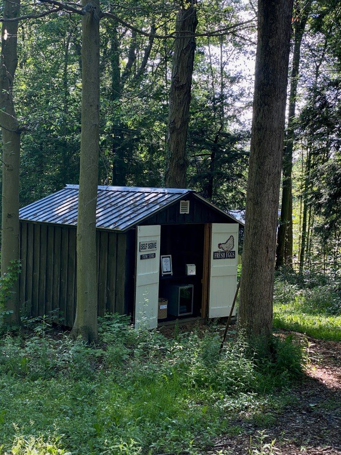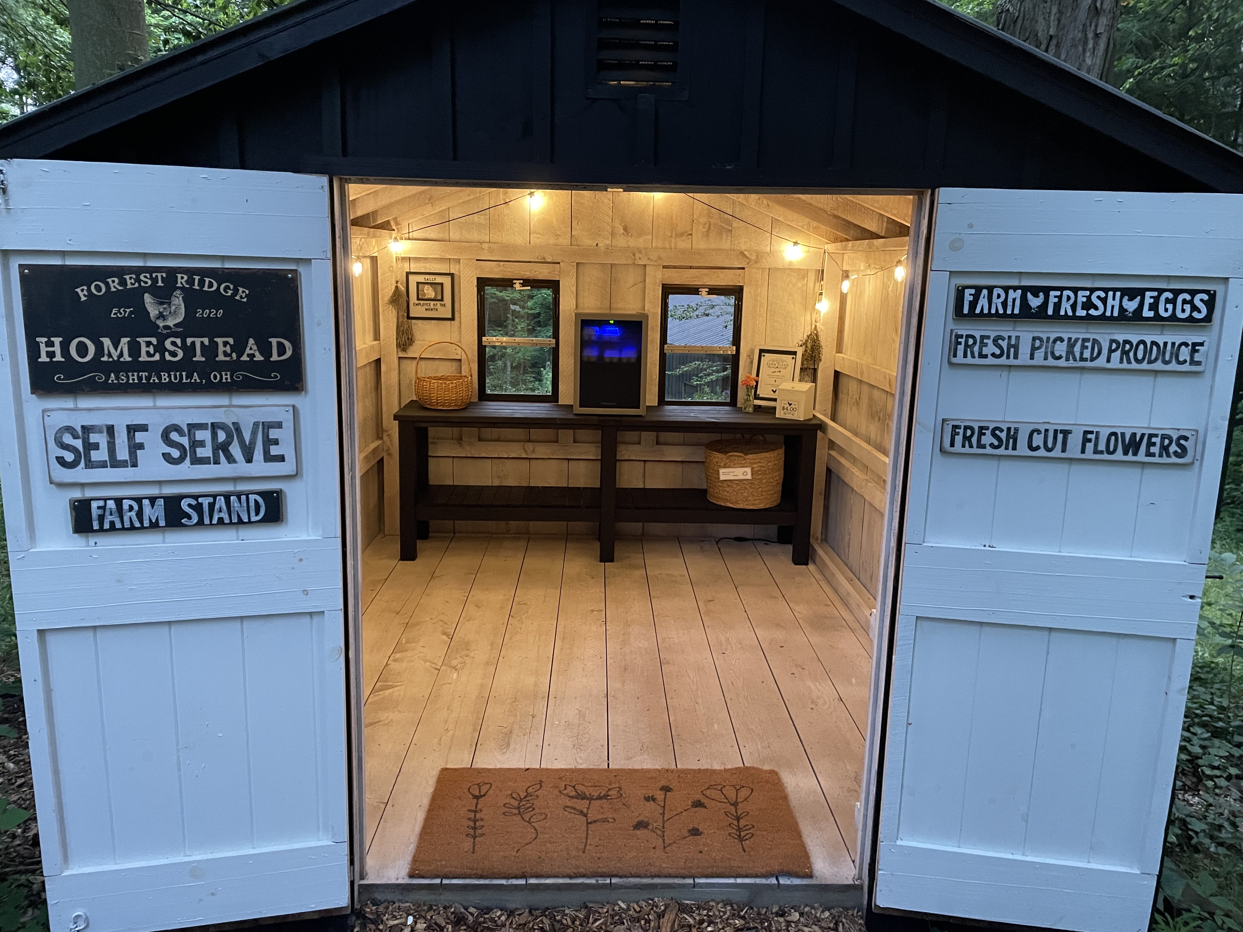 In 2022 we added a farm stand to sell our eggs. Because we had multiple outbuildings when we bought this property, we decided to use one of the 10′ x 12′ wooden sheds as an honor egg hut. For the first season we set up a beverage fridge just inside the door of the shed with a cash box and some signage.