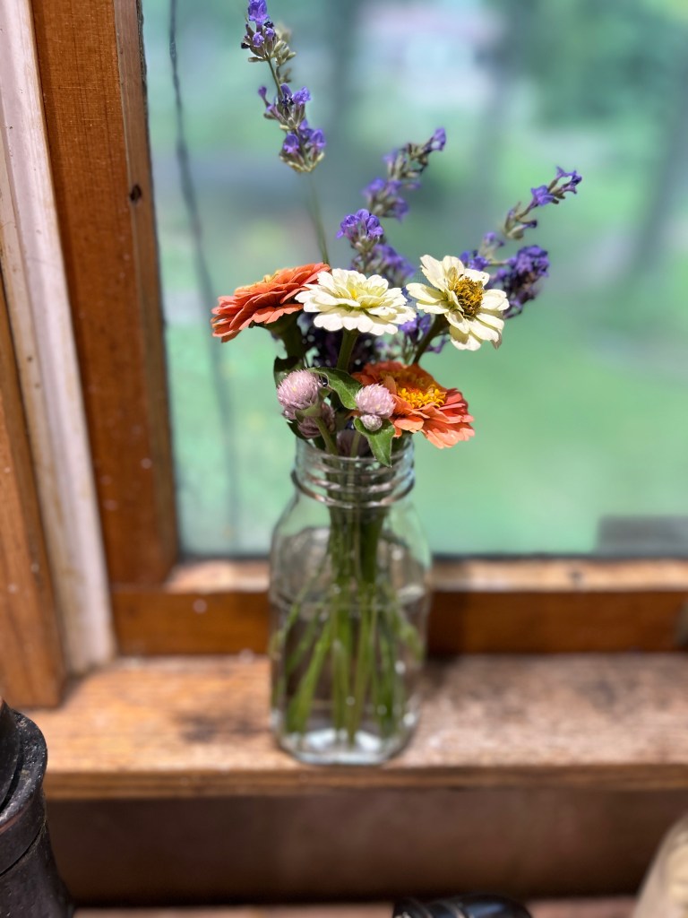 As I write this, out in the garden there are bees buzzing around all of the many yellow flowers waiting to turn into tomatoes and cucumbers and watermelons, and we even have a few apples on our first apple tree. There are blackberries waiting to ripen, and new flowers to be cut each evening that I get to enjoy in a mason jar vase on my windowsill. Our rooster Tyson is letting us know he is still alive, and several cats have just run up the stairs because some invisible danger apparently is happening outside our window. Life is pretty complete out here.